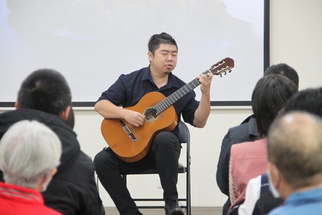 緊接著進入歡快的音樂沙龍時段,由加一吉他的郭尚諺老師獻上古典吉他組曲,有熱清奔放的〈西班牙鬥牛士舞曲〉,傳唱度極高並有多種語言歌詞發行的日文歌曲〈淚光閃閃〉、〈川流不息〉,還有大家耳熟能詳的〈外婆的澎湖灣〉等,細膩的旋律在會場中流動,聽友閉上眼專心聆聽、跟著哼唱,是忙碌生活裡難得的片刻美好。