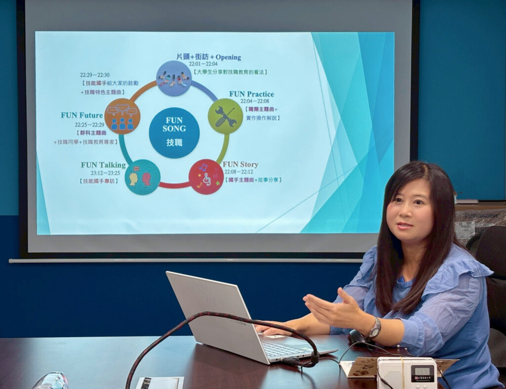 課程中,季潔老師也分享如何製作「FUN SONG技職」與「技職翻轉人生」的廣播節目。「FUN SONG技職」是與素人年輕人小五合作搭檔主持的少年節目,節目中規劃多元的單元設計、以及運用多元的聲音來呈現,另外還原創製作各職類主題曲、技能國手主題曲、群科特色主題曲、技職特色主題曲等,並加入音效,讓節目呈現更有層次感。