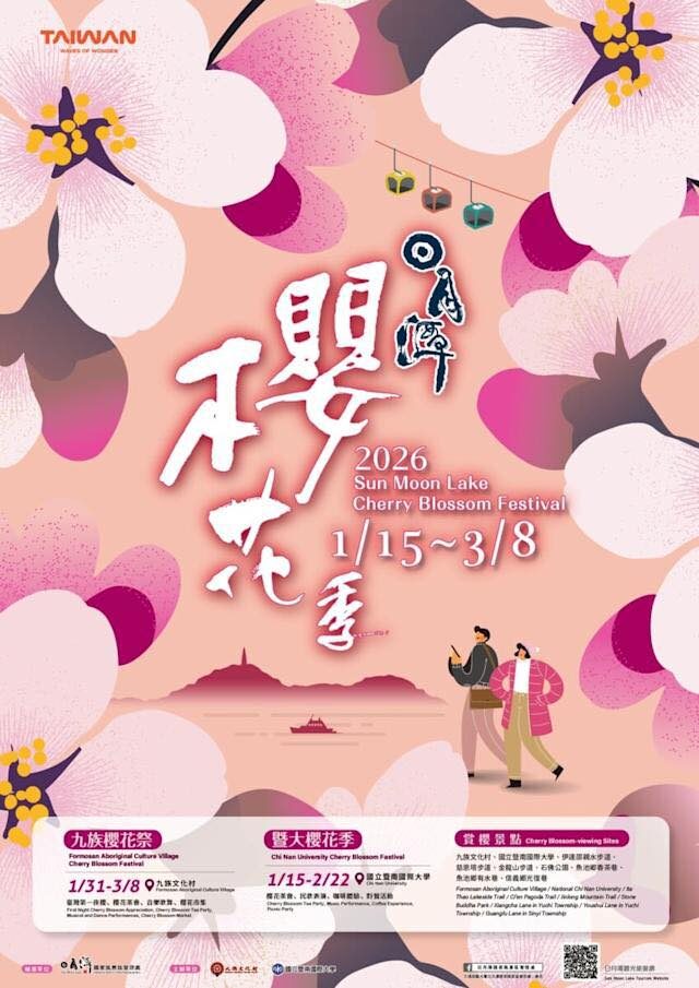 春天已經在路上,日月潭也已經準備好,用整座山、整片湖的櫻花,迎接大家。2026 日月潭櫻花季1 月 15 日到 3 月 8 日,相機準備好、心情放輕鬆,我們在日月潭,等你一起走進最浪漫的粉紅季節喔!