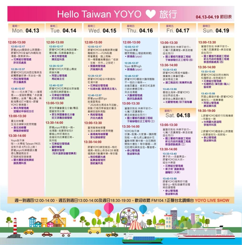 更多旅遊內容敬請鎖定台北調頻台 FM104.1 Yoyo Live Show『堯堯趴趴走,給你玩透透』單元,每週一到週四中午12點到下午2點、週五下午1點到2點及週日下午6點半到7點,豐富內容等你來探索粉絲團也上線啦,趕快來按讚!